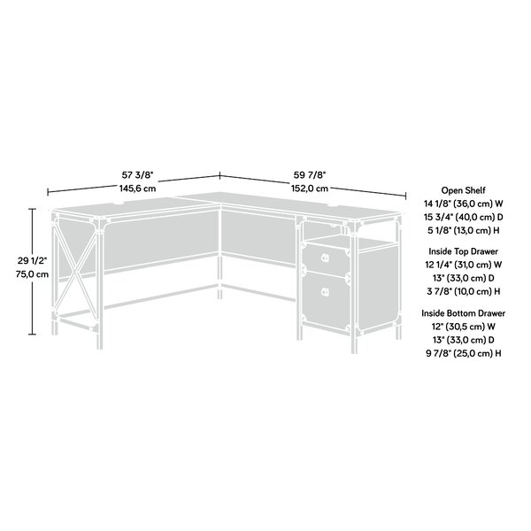 Your office deserves to be stylish too! Update the look of your home office or workspace with the industrial-inspired style and design of this L-shaped desk from the Steel River® collection. This office desk offers a spacious work surface that provides room for all your office must-haves like your laptop, stacks of notepads, writing utensils, and your hot cup of coffee. It even has space for home décor items like an accent lamp and decorative plants. This industrial desk features a small storage drawer that opens and closes on smooth metal runners. It also features a lower drawer with full extension slides that can hold letter-size hanging files so you can keep important papers organized. Its cord management system includes two desktop grommets to keep your cords neat and out of the way. This industrial office desk features a textured, powder-coated metal frame and corner accents. It's finished on all sides so it'll look great from any angle. Finished in Carbon Oak®, this stunning L-shaped desk is just what your home office needs.