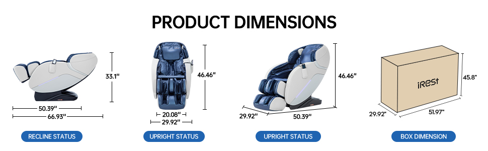 Product Model A303 Air Pressure 0.02-0.028MPa Noise ≤ 60dB Max Load Weight 330lbs Recommended Height Range 6.23ft Rated Voltage 110V-120V~ 60Hz Rated Power 120W Standby Power 0.1-1W Net Weight 183lbs Gross Weight 225lbs Product Dimension Upright status: 50.39"*29.92"*46.46" ; Recline status: 66.93"*29.92"*33.1" Packaging Dimension 61.41″*29.92″*33.86″ Safety Design Class I Product information